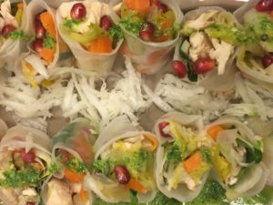- Entrée avec les restes du chapon : Rouleau « détox » dans feuille de riz avec chapon, radis noir (cru et râpé), carotte et poireau (cuits) et jus de mâche mixée avec huile d’olive.