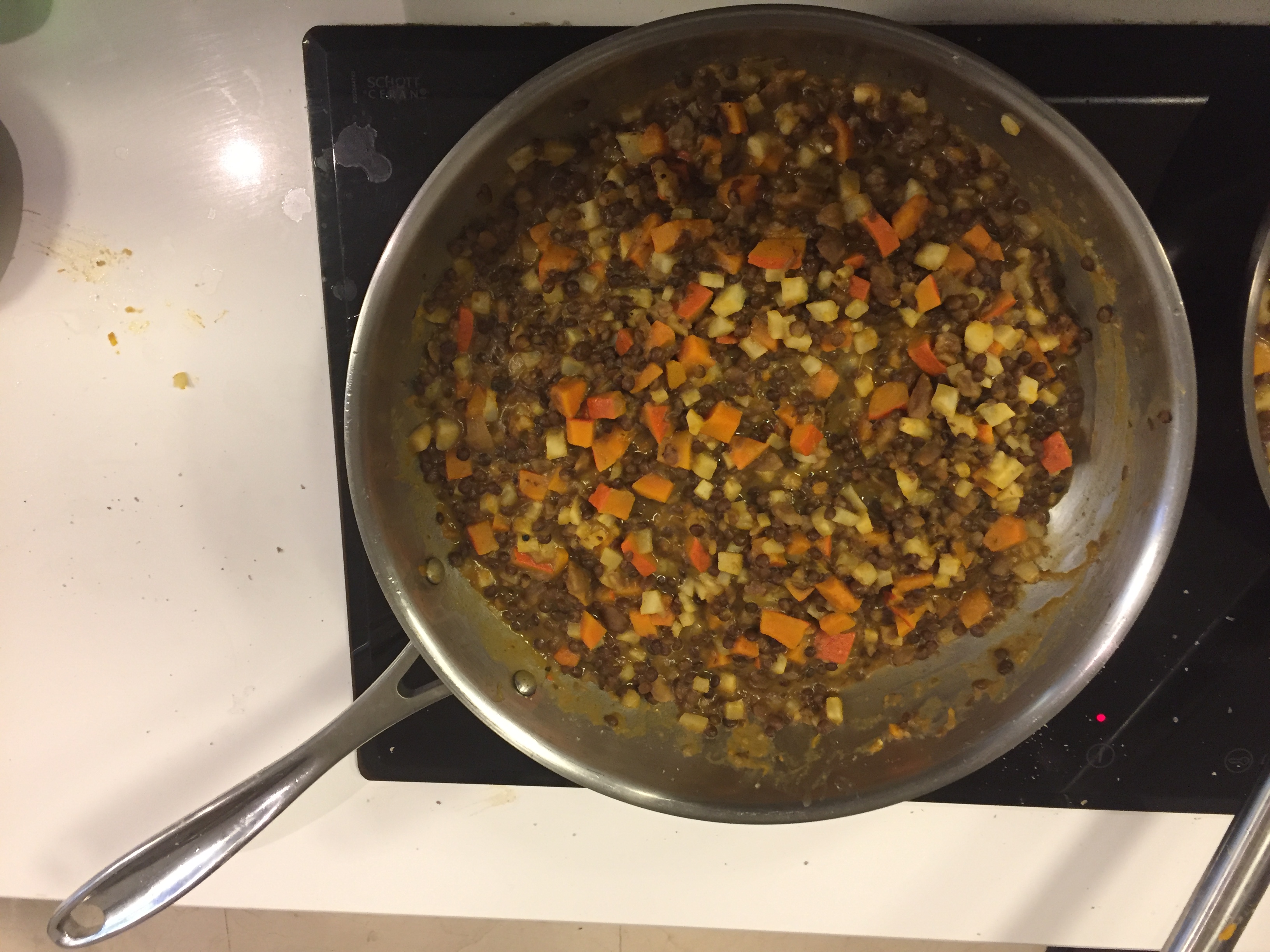 - Plat avec les restes des légumes de fêtes : risotto de lentilles, marrons, céleri rave, butternut et aquafaba (eau de cuisson des lentilles).