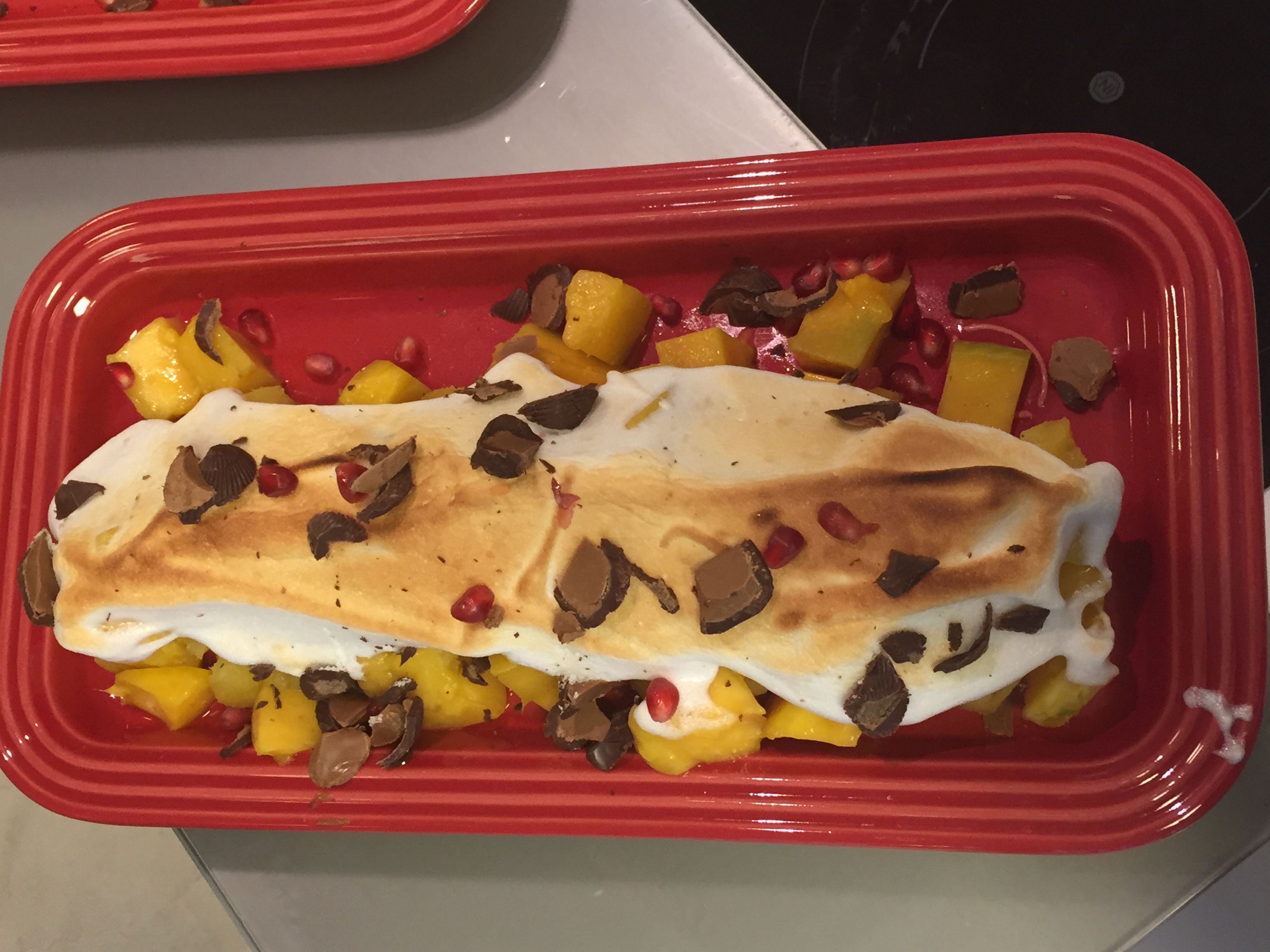 - Dessert avec des fruits exotiques, tendances des fêtes : comme une omelette norvégienne (monter des blancs en neige), ananas, mangue et éclats de chocolats de Noël.