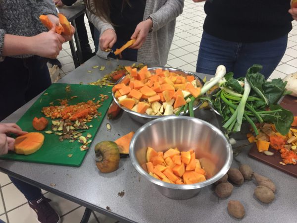 Afin de les accompagner, les élèves ont fait appel à des acteurs de l’économie sociale et solidaire pour réaliser des ateliers. Après un rapide quizz des étudiantes et un bilan du gaspillage alimentaire en France par SOLAAL, la Conserverie mobile de Romans a, en premier lieu, réalisé un atelier de découpage de quinze types de courges et légumes invendus. Le temps de faire cuire les produits afin de réaliser une soupe, l’après-midi a été consacrée à la présentation du Potager solidaire de Beaurepaire (26). Cette association propose à la vente des produits issus de leur jardin et de producteurs locaux. Un prix solidaire est fixé pour les bénéficiaires de l’aide alimentaire mais les produits peuvent être achetés par tout consommateur, au prix du marché.