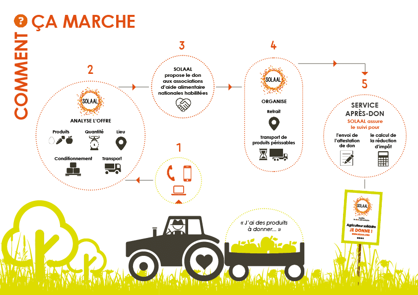 SOLAAL facilite et organise le don agricole, de l’exploitation agricole à l’association destinataire en passant par la gestion logistique. SOLAAL assure également un service après-don : retour de conditionnement consigné ou prêté, et aide dans votre déclaration fiscale, pour bénéficier de la réduction d’impôt.