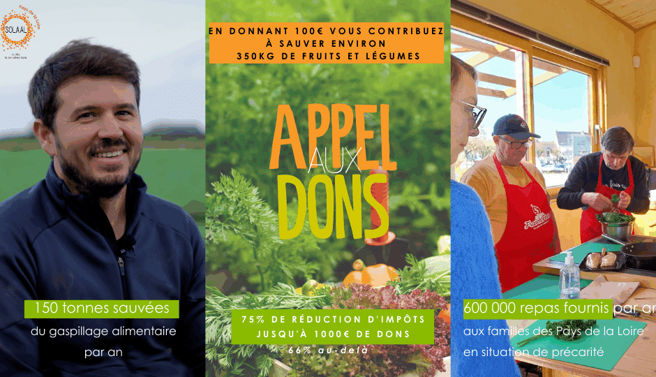 SOLAAL Pays de la Loire est une association reconnue d’intérêt général, qui facilite le lien entre les donateurs des filières agricole et alimentaire et les associations d’aide alimentaire. Nous lançons une campagne d’appel aux dons financiers pour soutenir l’activité de SOLAAL. Merci pour votre soutien, en donnant 100€ vous ne payez que 25€ et vous soutenez une mission solidaire.
