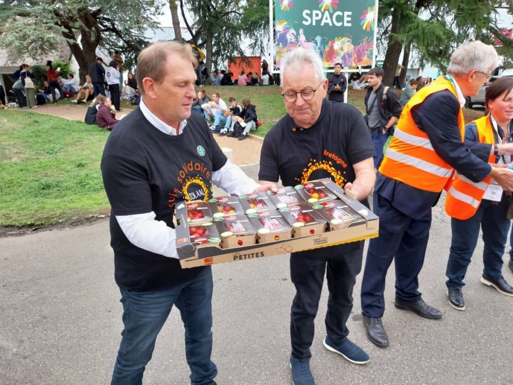 A cette occasion, plus d’une soixantaine de packs de lait ont été offerts par les éleveurs collectés par la laiterie St Denis de l’Hôtel, qui ont mis en place une opération le Lait du Cœur. (plus d’informations ici). En complément une soixantaine de colis de tomates ont été donnés par SOLARENN, entreprise maraichère bien connue sur les terres bretonnes.