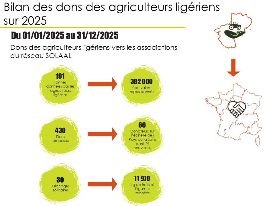 SOLAAL est un réseau national, lorsque certaines régions ont trop de produits, nous élargissons nos offres de dons pour les faire bénéficier aux régions voisines. Grâce à l’implication des associations, de mécénat logistique, plus de 845 000 repas ont pu être redistribués auprès des personnes en situation de précarité alimentaire sur la Région des Pays de la Loire.